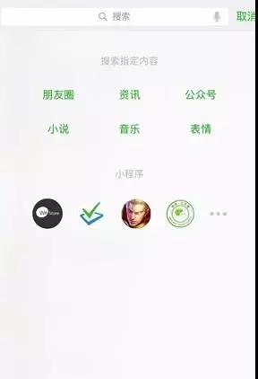 微信 + 搜狗形成微生態中強大的搜索引擎。微信搜索頁面還有小程序的快捷入口,為常用的小程序帶來更多的曝光和開啟機會。